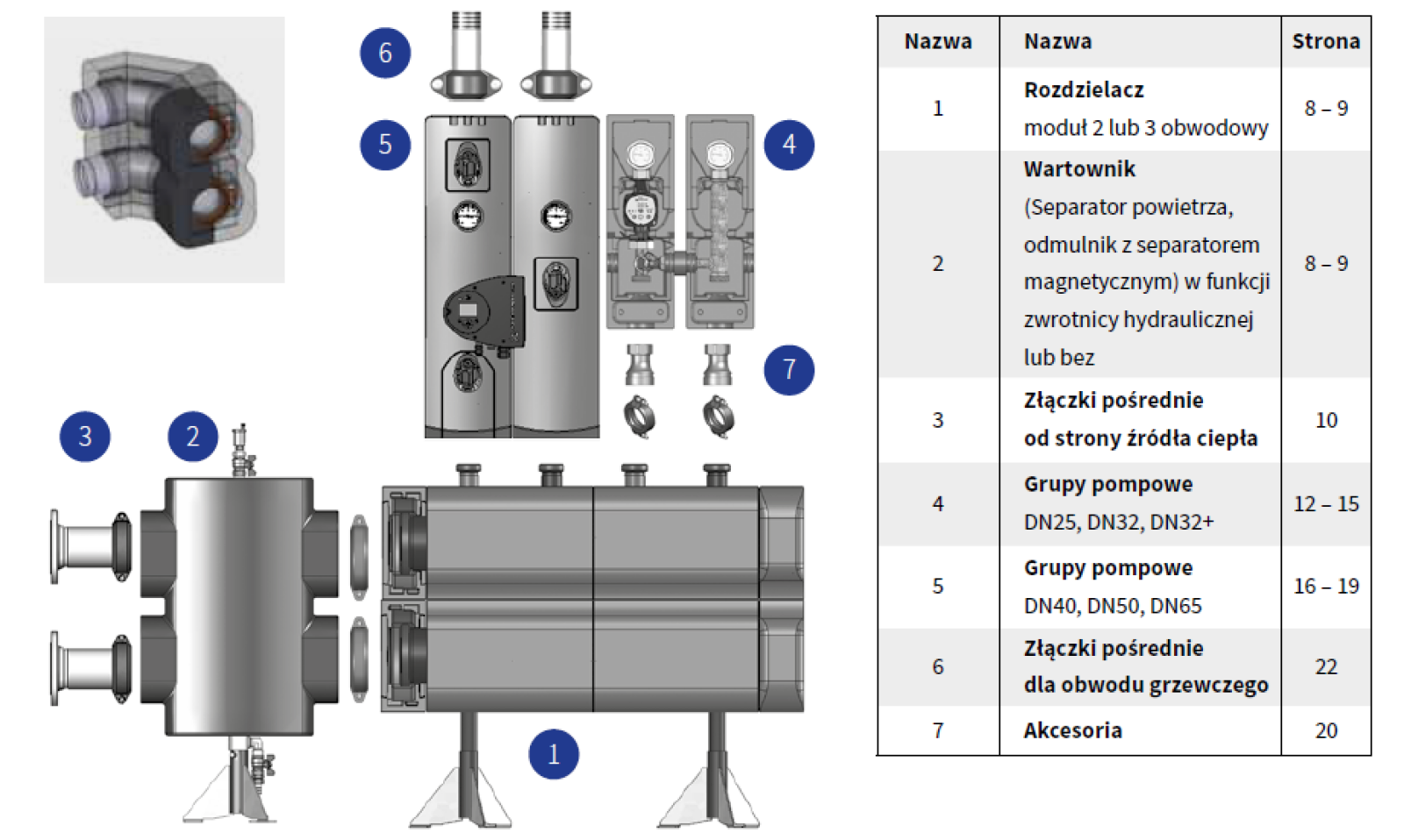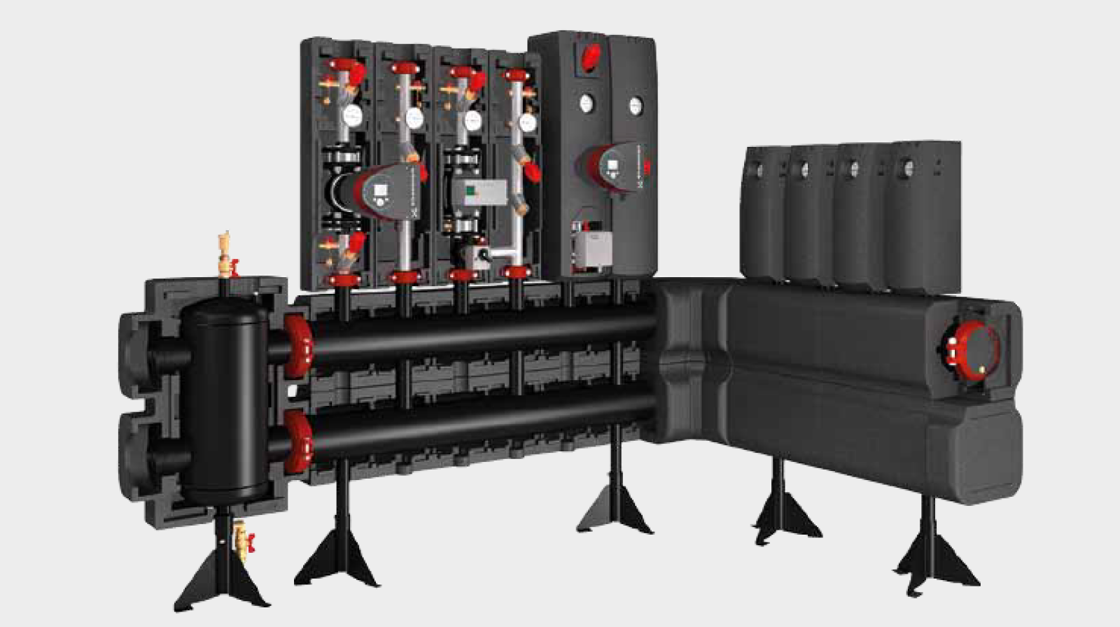 Trzeci filar to grupy pompowe w zakresie od DN25 do DN65, fabrycznie zmontowane i przeznaczone do montażu bezpośrednio na rozdzielaczach. W standardzie są wyposażone w zawory odcinające, zawór zwrotny oraz dopasowaną izolację z EPP. W większych średnicach (DN40–DN65) przewidziano także filtr siatkowy, co w dużych instalacjach bywa kluczowe już na etapie rozruchu.