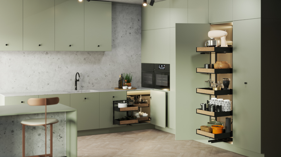 Projektanci zyskują dostęp do pełnego spektrum rozwiązań – od elementów konstrukcyjnych niewidocznych na pierwszy rzut oka, przez systemy jezdne i organizację wnętrza, kolekcje uchwytów oraz oświetlenie meblowe, aż po najbardziej wyeksponowane części projektu: płyty, fronty i blaty.