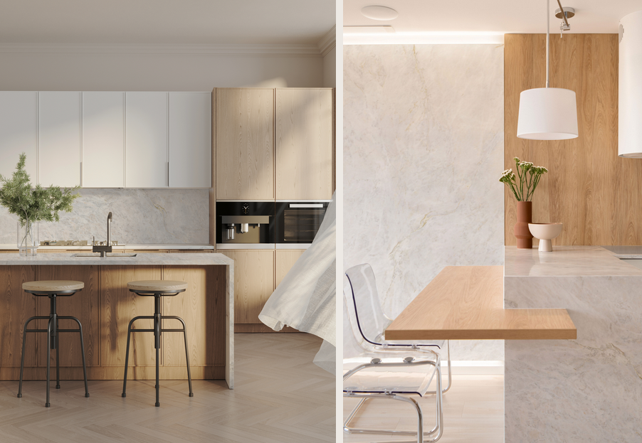Takie powierzchnie pozwalają tworzyć wyrafinowane kompozycje na blatach, okładzinach ściennych, meblach czy innych elementach architektonicznych. Dodają wnętrzu osobowości, ale robią to z umiarem i świadomością. Dzięki temu przestrzeń nie traci harmonii, a zyskuje szlachetny, dopracowany wyraz.