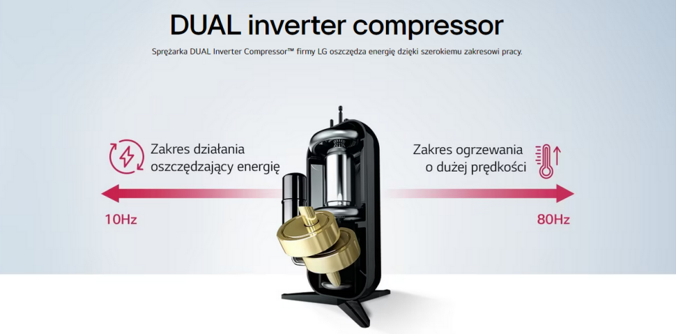 Połączenie podwójnej sprężarki inwerterowej i nowoczesnego silnika BLDC pozwala zredukować poziom emitowanego hałasu do zaledwie 53 dBA (mocy akustycznej). Dzięki luksusowemu, srebrnemu wzornictwu urządzenie nie musi być chowane w kotłowni. Nadaje się do instalacji w garażu, pralni, kuchni, a nawet bezpośrednio w łazience, stając się eleganckim elementem wyposażenia nowoczesnego domu.
