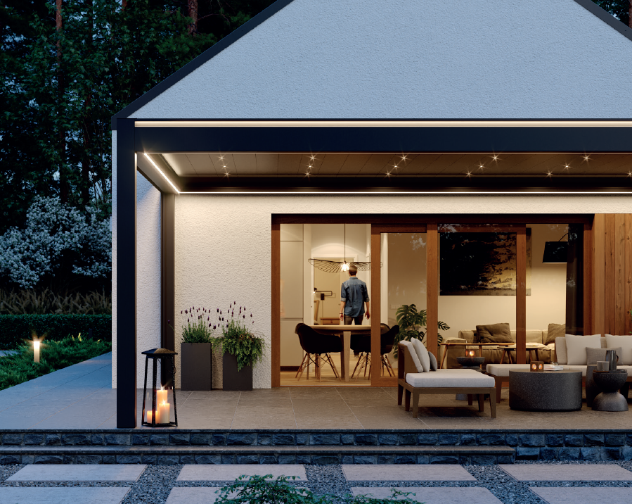 Na funkcjonalność systemu wpływa także możliwość rozbudowy o praktyczne rozwiązania dodatkowe. Pergolę można wyposażyć w oświetlenie liniowe LED, które buduje nastrój po zmroku i zwiększa komfort korzystania z tarasu wieczorem. Dostępny jest również promiennik ciepła, dzięki któremu sezon tarasowy można wydłużyć o chłodniejsze dni i wieczory.