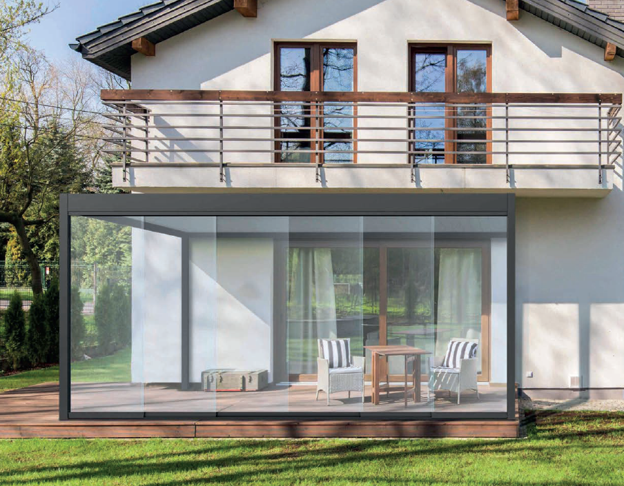 System można również rozbudować o kaskadowy system szklanych drzwi przesuwnych Slide Glass. Jest to system przesuwny do zabudowy szklanej bez izolacji termicznej, który wyróżnia minimalna widoczność krawędzi profili aluminiowych. Dzięki temu zabudowa zachowuje transparentność i wizualną lekkość, a sama konstrukcja pozostaje nowoczesna i spójna z aktualnymi trendami w projektowaniu stref tarasowych.