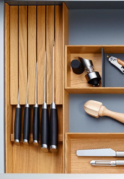 Naturalne drewno podnosi wizualną jakość zabudowy i dobrze komponuje się zarówno z kuchniami nowoczesnymi, jak i klasycznymi. Modułowa konstrukcja pozwala dopasować układ wkładu do konkretnej szuflady, dzięki czemu można wygodnie uporządkować sztućce, akcesoria kuchenne i drobne elementy używane podczas gotowania.