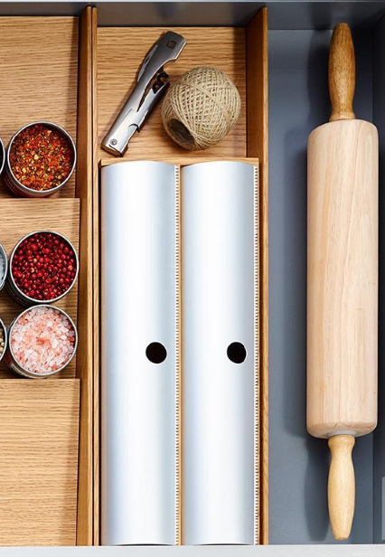 Folia spożywcza, papier do pieczenia czy folia aluminiowa często zajmują dużo miejsca w szufladzie. Rolki przesuwają się, rozwijają i trudno utrzymać je w jednym miejscu, szczególnie wtedy, gdy przechowujemy kilka produktów o podobnym kształcie.
