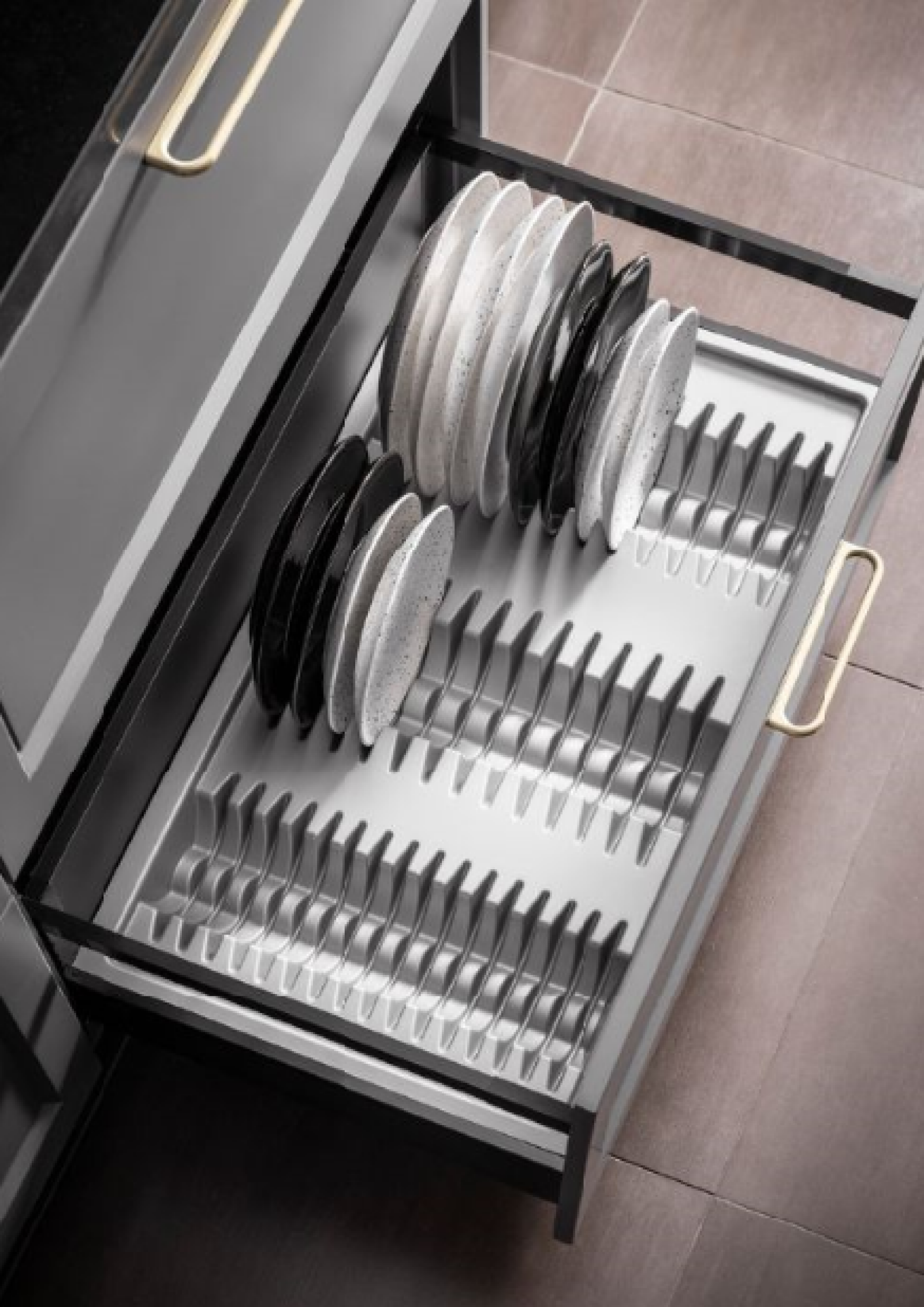 Każdy talerz, niezależnie od wielkości, jest łatwo dostępny, bez konieczności wyjmowania całego stosu. Nawet najbardziej delikatna zastawa pozostaje bezpieczna dzięki ergonomicznemu i stabilnemu wkładowi. To rozwiązanie szczególnie przydatne w głębokich szufladach, w których można wygodnie przechowywać talerze obiadowe, deserowe i głębokie.