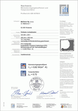 BeClever już przed trzema laty uzyskał certyfikaty dotyczące izolacyjności termicznej wydane przez prestiżowy Instytut IFT (Institut für Fenstertechnik) Rosenheim w Niemczech. Obecnie, w celu kolejnego usankcjonowania rozwoju techniczno-technologicznego produktu, BC postanowił przeprowadzić ponowne badania w zakresie termoizolacyjności i uzyskał wręcz imponujące parametry izolacyjne skrzynek roletowych.