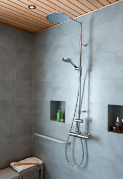 Pozwala ona poczuć relaksujący strumień, który działa jak odświeżające krople deszczu. Kąt górnej głowicy prysznica jest regulowany, tak więc woda nie musi spływać jedynie pionowo. W miarę potrzeby strumień można lekko skierować do przodu. Poranna kąpiel jest szybka, dodaje energii na cały dzień, i dodatkowo jest ekologiczna.