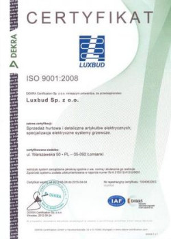 Jest on potwierdzeniem skutecznego wdrożenia Systemu Zarządzania Jakością zgodnie z normą 9001:2008 w zakresie: Sprzedaż hurtowa i detaliczna artykułów elektrycznych; specjalizacja elektryczne systemy grzewcze. Certyfikat ISO 9001:2008