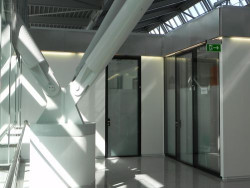 Jak mówi inż. arch. Ireneusz Asman z biura „Asman Pieniężny Architekci” ap-a.pl, które zajęło się aranżacją tej części lotniska, „Zadanie polegało na tym, aby w istniejącej, zamkniętej tkance Terminala A zaprojektować dodatkowe pomieszczenia biurowe. Pytanie, jakie sobie postawiliśmy, było następujące: w jaki sposób umieścić dużą kubaturę powierzchni biurowej w istniejącym, funkcjonującym organizmie tak, aby nie zachwiać jego struktury i nie zaburzyć istniejącej przestrzeni?”.