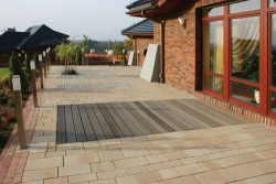 Stosunkowo duża przestrzeń do zagospodarowania pozwala na działanie z rozmachem i łączenie na jednym tarasie materiałów posiadających zgoła odmienną naturę. Oprócz uzyskania interesującego efektu estetycznego, możliwe jest wydzielenie poszczególnych stref funkcjonalnych w obrębie jednego tarasu. Bardzo atrakcyjnym połączeniem, dającym ciekawy efekt wizualny jest zestawienie dekoracyjnej kostki brukowej z drewnem.