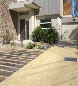 Jasna piaskowa barwa kostek sprawia wrażenie lekkości, rozciągając optycznie przestrzeń tarasu. Bardziej nasycony kolor drewna przesuwa wąskie przejście do wnętrza budynku na drugi plan. Inny przykład – luźno ułożone ciemne, drewniane podkłady wytyczają ciąg pieszy prowadzący do drzwi wejściowych. Podjazd do garażu pokrywa jasna, kontrastowa kostka.