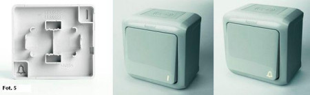 Estetyczne połączenie kształtu i koloru, zaokrąglone krawędzie i połyskujące wykończenia dostępne w dwóch kolorach: białym i szarym to cechy charakterystyczne osprzętu Forix IP44. Łączniki lub przyciski pojedyncze mogą być podświetlone za pomocą uniwersalnej lampki LED a wyboru piktogramu dokonujemy przez obrót klawisza o 180 stopni (fot.5).