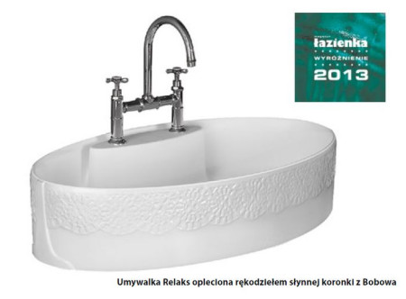 Umywalka RELAKS - Wybór Roku wnosi do łazienki przyjemność, harmonię i spokój. Charakterystyczny element wzorniczy, który ją oplata to rękodzieło artystyczne, wykonane na nasze zamówienie przez artystkę ze słynnych Koronek z Bobowej. Wzór tej przepięknej koronki został przełożony na technologię produkcji umywalek, co nadało umywalce oryginalny styl.