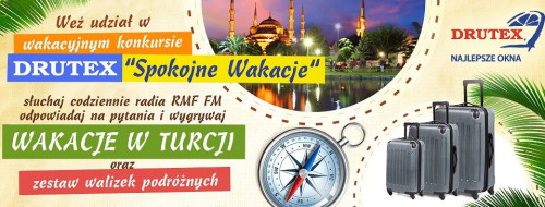 Konkurs “Spokojne wakacje” organizowany jest przez DRUTEX w terminie 15 lipca – 9 sierpnia br. na antenie radia RMF FM i stronie internetowej www.rmf.fm i stanowi angażującą dla słuchaczy akcję związaną z zabawą w kontekście przygotowań do spokojnego wyjazdu bez zamartwiania się o własny dom.