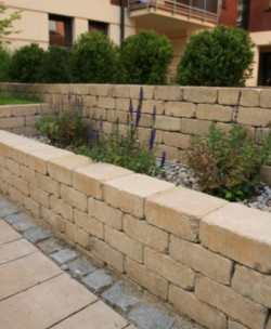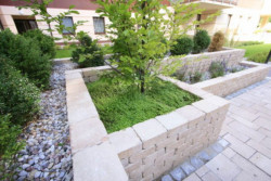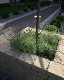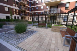 Do piaskowych części elewacji nawiązują ścieżki i tarasy z kostek Via Castello w kolorze pastello, a także murki i duże donice ukształtowane z postarzanych kostek Natulit Massimo. Dbałość o szczegóły objawia się również w odpowiednim doborze barw ławek i koszy na śmieci.