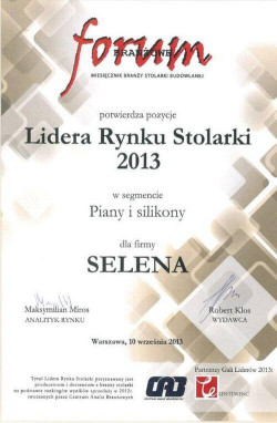 Firma Selena SA od lat wszystkie swoje starania wiąże z dostarczeniem na rynek budowlany określonych wartości, zarówno dla partnerów handlowych, jak i wykonawców czyli użytkowników końcowych. Skutkuje to uznaniem, które zobowiązuje i dopinguje do bycia coraz lepszym. Przyznana firmie Selena SA nagroda Lider Rynku Stolarki 2013 jest cennym potwierdzeniem bardzo wysokiej pozycji rynkowej firmy.