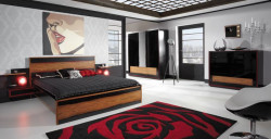 Sypialnia Flamenco to nowoczesne meble, które w zamyśle projektantów zapewne budzić miały skojarzenia z andaluzyjskim tańcem pełnym ekspresji i pasji, bowiem zachwycają dynamizmem form i bogatą kolorystyką o barwach spotykanych wśród rozłożystych sukien, chust i wachlarzy tancerek Flamenco. W sypialni w wersji kolorystycznej notte dominuje głęboka czerń naturalnej okleiny modyfikowanej i szkła, która ciekawie współgra z palisandrową aplikacją i akcentami czerwieni. Najważniejszym meblem pomieszczenia jest oczywiście wygodne dwuosobowe łóżko. Obowiązkowo na stelażu ze sprężystymi listwami, aby zapewnić komfort wypoczynku.