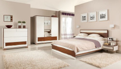 W opcji dodatkowej posiada schowek na pościel z podnośnikiem materaca. Łóżko przykuwa uwagę szerokimi listwami: w zagłówku i szczycie dolnym. Struktura palisandrowej okleiny z wyraźnym usłojeniem jest niezwykle dekoracyjna, dodatkowo uroku dodaje jej nieregularna linia, która sprawia, że listwa przypomina surową deskę wyciętą z tego egzotycznego drzewa. Motyw palisandrowej dekoracji pojawia się także w pozostałych meblach – zdobi fronty szuflad szaf i komód, jest elementem toaletki i stołka oraz wielu innych brył tej różnorodnej kolekcji. Po obydwu stronach łóżka jego nieodłączne towarzyszki –niewielkie szafki nocne z szufladami otwieranymi na dotyk i podręcznymi półeczkami.
