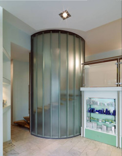 Innym przykładem zastosowania szkła profilowego jest ścianka okalająca schody na antresolę w Miejskiej Farmie Urody IZAR-REPÊCHAGE w Warszawie. Półokrągła ścianka wykonana ze szkła Pilkington Profilit™ to nie tylko ciekawy akcent estetyczny, ale również alternatywa dla tradycyjnej balustrady schodowej.
