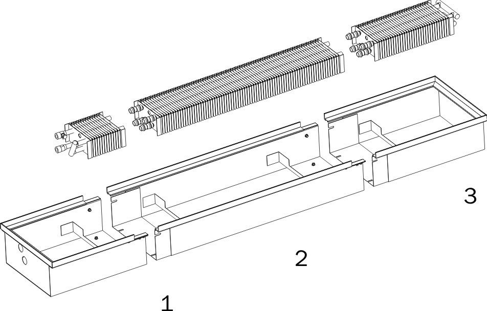 Moduł początkowy, moduł końcowy i zmienna liczba modułów pośrednich tworzą kompletne zestawy kanałów grzewczych. Kombinacja modułów pośrednich umożliwia zestawienie kanału grzewczego dowolnej długości z dokładnością do 20 cm.