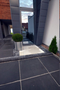 Bezpośrednio przed strefą wejściową wykorzystane zostały, wyraźnie kontrastujące z otoczeniem, jasnoszare, wielkoformatowe, ręcznie odlewane płyty z betonu architektonicznego z linii Libet Stampo (120x40x10 cm). Ich prostokątny kształt i klasyczna, minimalistyczna forma harmonijnie nawiązuje do architektury budynku, tworząc jednocześnie ciekawy dekor aranżacyjny.