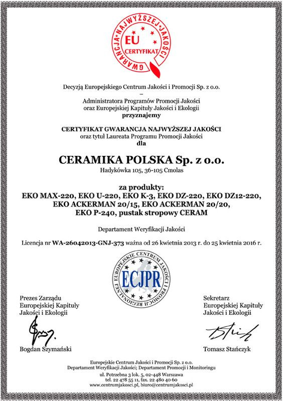 Otrzymanie tego certyfikatu potwierdza, że CERAMIKA POLSKA Sp. z o.o. jest przedsiębiorcą nowoczesnym i konkurencyjnym zarówno na rynkach krajowych jak i zagranicznych oraz wybitnie wyróżniającym się jakością usług oraz oferowanych produktów.