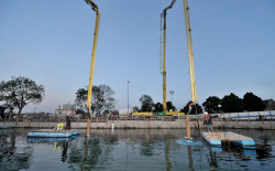 Proces wylewania betonu pod wodą był wyjątkowy z wielu względów. Jednym z nich była technologia podawania betonu. Warstwa wylanego betonu ma grubość od 1,5 do 2,0m. Mieszankę betonową podano pod wodę za pomocą dwóch podajników do betonowania podwodnego oraz trzech pomp.
