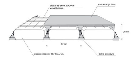 Stropy gęstożebrowe Termalica składają się z pustaków z betonu komórkowego w klasie gęstości 500 kg/m3 o rozmiarach 599x200x249 mm oraz prefabrykowanych belek żelbetowych, będących połączeniem betonowej stopki o przekroju 40x120 mm i zatopionego w niej dolnego pasa przestrzennej kratownicy stalowej. Belki dostępne są w długościach od 2,1 m do 7,2 m, a ich rozstaw osiowy wynosi 670 mm.