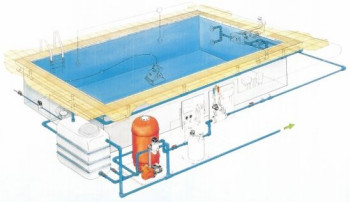 Rysunek przedstawia basen skimmerowy. Z lewej strony widać zamontowany skimmer. Pompa obiegowa filtra zasysa wodę i tłoczy ją przez filtr basenowy. Filtr zbiera zanieczyszczenia znajdujące się w wodzie basenowej, w dalszym biegu znajduje się urządzenie korygujące wartość pH oraz dozujące środki dezynfekcji wody, środek glonobójczy. Następnie woda przechodzi poprzez wymiennik ciepła gdzie jest podgrzewana z instalacji co (zamiast wymiennika można zastosować podgrzewacz elektryczny lub kolektory słoneczne).