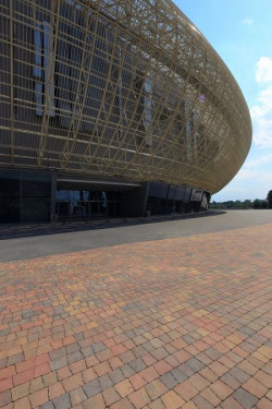 Zostawiając za sobą dym z pistoletów i muzykę dobywającą się z szafy grającej, jedziemy dalej – do Krakowa, gdzie krzyki rewolwerowców zamieniamy na okrzyki przygotowujących się do meczu kibiców. Tutaj na uwagę zasługuje nawierzchnia wykonana z zupełnie innego rodzaju betonowej kostki – modernistycznej, dopasowanej do bryły stadionu Kraków Arena. Prostokątna, o uszlachetnionej, płukanej fakturze, kostka Polbruk Urbanika współgra tu ze stalową konstrukcją. Odrobinę beztroski wnosi natomiast do projektu kostka z linii STYL – Polbruk Carmino w kolorze grafitowym i indiana (żółto-czerwono-czarnym). Ułożona tuż przy samym obiekcie kostka Carmino, mieniąc się tysiącem barw, ożywia go, czyniąc otoczenie wokół stadionu przystępnym i miłym dla oka.