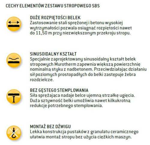 Belki SBS 140 i SBS 170 różnią się wysokością i układem zbrojenia. Wytwarzane są na najnowocześniejszych liniach produkcyjnych z betonu C40/50 i splotów ze stali ø12,5. Keramzytobetonowe pustaki stropowe MUROTHERM wyróżniają się niewielką masą, co korzystnie wpływa na obniżenie obciążenia ścian stropami.