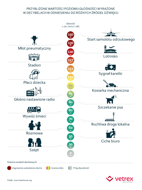 Wybierając okna, które skutecznie ochronią przed hałasem należy wziąć pod uwagę poziom hałasu panującego w danej lokalizacji. Niestety, aktualne mapy akustyczne dostępne są tylko dla wybranych miejscowości, głównie dużych miast, dlatego większość inwestorów musi samodzielnie ocenić natężenie hałasu na podstawie obserwacji. Na powyższej grafice przedstawione zostały przybliżone wartości poziomu głośności często spotykanych hałasów. Posługując się tymi danymi można oszacować z jakim natężeniem dźwięku będziemy mieli do czynienia, decydując się na budowę domu w danej okolicy.