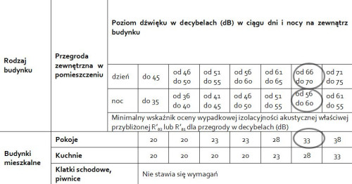 Dopuszczalny poziom dźwięku w domach oraz innego rodzaju budynkach określają normy. Poniższa tabela zawiera wytyczne dotyczące izolacyjności akustycznej ścian. Parametry te informują o maksymalnym dopuszczalnym poziomie hałasu w domu przy danym natężeniu dźwięków napływających z zewnątrz, a spełniająca normy przegroda ma zapewnić, że nie zostanie on przekroczony. Załóżmy, że dom znajdować się ma w pobliżu dość ruchliwej drogi, gdzie poziom hałasu zewnętrznego w dzień wynosi 68 dB, a nocy 58 dB, natomiast powierzchnia okien zajmuje poniżej 50% powierzchni ścian zewnętrznych. W takim przypadku minimalna wypadkowa izolacyjność akustyczna ściany (tłumienie akustyczne przegrody) wynosi 33 dB.