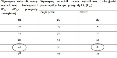 W ten sposób, dla przywołanego przykładu, w którym wymagane wartości wynoszą R’A1 = 30dB i R’A2 = 30dB, stolarka powinna mieć następujące parametry: