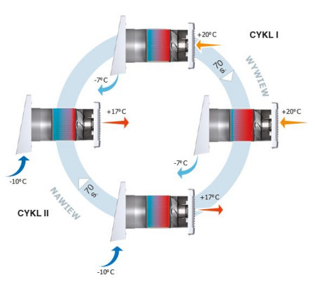 CYKL II. Świeże czyste powietrze z zewnątrz przechodzi przez ceramiczny wymiennik absorbując skumulowaną w nim wilgoć i energię cieplną. Kiedy temperatura wymiennika spada, wentylator przełącza się ponownie na tryb wywiewny. Zmiana cyklu operacyjnego ma miejsce co 70 sekund.