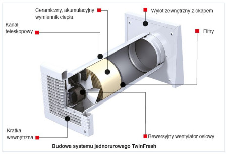 System jednorurowy zbudowany jest na bazie kanał teleskopowego z PCV o zakresie długości 120-470 mm. Wewnątrz znajduje się wentylator rewersyjny, ceramiczny, akumulacyjny wymiennik ciepła oraz dwa filtry powietrza. Zakończony kratką wentylacyjną wewnętrzną oraz wylotem zewnętrznym ze stali malowanej proszkowo. Kratka wewnętrzna może być wyposażona w automatyczną żaluzję (model R) lub płaski dekoracyjny panel (model S). Wszystkie modele wyposażone zostały w system sterowania za pomocą przełączników na obudowie oraz pilota zdalnej obsługi.