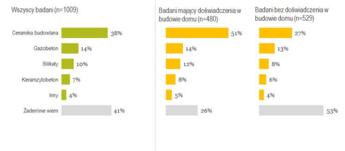 Materiał najbardziej wartościowy We wspominanym badaniu, Polacy jako materiał najbardziej podnoszący wartość budynku wskazali ceramikę budowlaną (38%), zaledwie 14% gazobeton, który uplasował się na drugim miejscu, silikaty (10%), keramzytobeton (7%). Przy czym w grupie respondentów, którzy mają już doświadczenia w budowie domu, ponad połowa wskazała ceramikę (51%).** Dlaczego właśnie cegła jest tak ceniona? Nowoczesne materiały wyprodukowane z gliny łączą w sobie właśnie te najbardziej pożądane cechy: bardzo dobrą izolacyjność cieplną i akustyczną, najwyższą trwałość, ognioodporność, czy mineralny skład przyjazny dla zdrowia i środowiska. Domy stawiane z dobrej jakości ceramiki po latach niewiele tracą na swojej wartości, więc mogą stanowić także lokatę kapitału. To wszystko sprawia, że jest to najczęściej wybierany materiał do budowy domu w naszym kraju. Jak po raz kolejny pokazało badanie oferteo.pl w 2014 roku aż 40,9% respondentów wybierało cegłę do wznoszenia ścian.