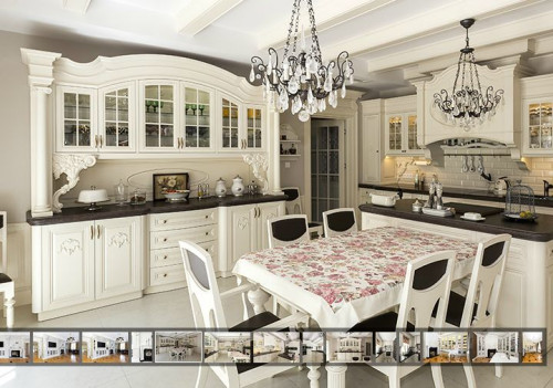 Klasyczna zabudowa RTV oraz rzeźbiony portal kominkowy w stylu francuskim nie przytłaczają ilością detali. Na dzielących przestrzeń pilastrach pojawiają się wdzięczne festony.