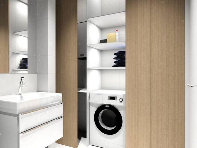 Projektantka wykorzystała kształt pomieszczenia do stworzenia zamykanej przestrzeni na składowanie, piecyk i pralkę, dzięki czemu wnętrze nie sprawia wrażenia przeładowanego. Drzwi przesuwne doskonale nadały się do małej przestrzeni, nie kolidując ze sprzętami, a dobór jasnego drewna, bieli ceramiki w zestawieniu z kontrastowymi czarno - białymi płytkami Pret-a-Porter Opoczno ocieplił i nadał pomieszczeniu spektakularnego, nowoczesnego charakteru. Umywalka Metropolitan marki Opoczno naprzeciwko wejścia stworzyła oś widokową a użycie lustra na całą szerokość ściany jeszcze bardziej powiększyło optycznie przestrzeń.