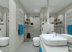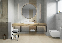 Trzecią nagrodzoną aranżację, wykonaną przez WizualHome3D, wybrano ze względu na umiejętny mariaż klasycznego stylu płytek kolekcji Light Marble Opoczno z nowoczesnym, minimalistycznym designem ceramiki i mebli łazienkowych. Całkowicie klasyczne wnętrze w tym przypadku mogłoby się kojarzyć z czymś nudnym i przewidywalnym, przy nowoczesnym istniała obawa, że wyjdzie z mody w krótkim czasie. Zaproponowana aranżacja pogodziła oba style, a dodatki w postaci drewnianej półki i kosza, wprowadziły do wnętrza klimat przytulności.