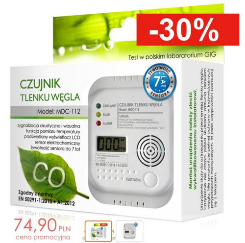 Czujnik MDC-112 wyposażony jest w 7-letni elektrochemiczny sensor CO. Dzięki funkcjom oszczędzania energii maksymalnie wydłużono czas pracy na jednym komplecie baterii.