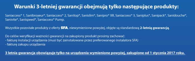 Na wybrane pompy i pomporozdrabniacze domowe SFA udzielamy 3-letniej gwarancji. Aby ją zdobyć należy zakupić jeden z produktów wymienionych poniżej, zainstalować go przez preferowanego instalatora SFA i w terminie 3 miesięcy od daty zakupu przesłać do nas wypełnioną kartę gwarancyjną znajdującą się w pudełku lub zarejstrować gwarancję na stronie internetowej www.sfapoland.pl w zakładce /Gwarancja/