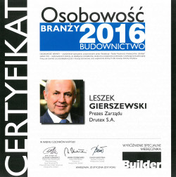 „Drutex Budowlaną Firmą Roku – to brzmi dumnie. Cieszę się, że po raz kolejny otrzymaliśmy wyróżnienie potwierdzające naszą siłę, możliwości i aspiracje. Jesteśmy firmą z ponad 30-letnią tradycją i od zawsze wyznaczaliśmy sobie odważne cele, czego wynikiem jest dzisiejsza pozycja firmy w Polsce i Europie. Jesteśmy przecież wiodącym europejskim producentem okien o ustabilizowanej pozycji, cenionym na świecie. Nasze produkty docierają do najbardziej prestiżowych lokalizacji, jak chociażby hotel Hilton w Nowym Jorku czy fabryka Lego w Meksyku. Takich wyników nie osiąga się z dnia na dzień. To lata pracy i zaangażowania całego zespołu. Przyznany nam tytuł jest nagrodą na starania i ambicje całego zespołu.” – mówi Leszek Gierszewski, prezes Drutex S.A.