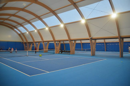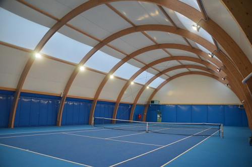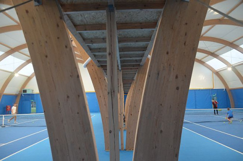 Pokrycie dachu stanowi powłoka membranowa PCV. Układ uzupełniony dodatkowo o tężniki drewniane i stężenia stalowe.