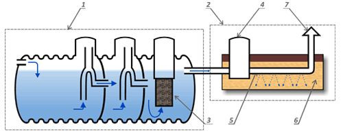 Na poniższej ilustracji można zobaczyć, jak jest zbudowane i jak działa szambo ekologiczne w połączeniu z drenażem.