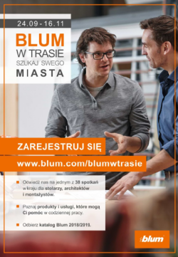 Rejestracja, harmonogram oraz dodatkowe informacje o Blum w trasie 2018 dostępne na www.blum.com/blumwtrasie. Pytania dotyczące akcji, można zadawać mailowo (marketing.pl@blum.com) lub telefonicznie (61 895 19 00).