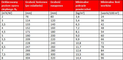 Poniższe obliczenia poziomu oporu cieplnego RD przy danej grubości zasypu granulatem wykonano w oparciu o normę europejską EN 14064-1: 2012, przy uwzględnieniu efektu osiadania granulatu (wartość 5% dla gęstości nasypowej ok. 45 kg/m3):