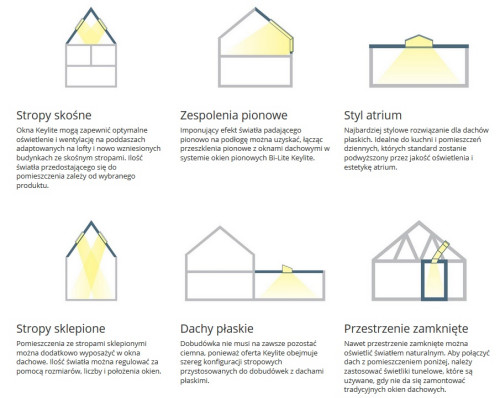 Wychodzące na północ Tego typu okna nie są bezpośrednio oświetlane promieniami słonecznymi. Przechwyć więcej światła dziennego, wybierając większe okna dachowe. Wychodzące na południe Jest to ustawienie optymalne do bezpośredniego oświetlania pomieszczeń światłem słonecznym. Wychodzące na wschód Z uwagi na wschodzące słońce pomieszczenia są wówczas oświetlane bezpośrednio w godzinach porannych. Wychodzące na zachód Z uwagi na zachodzące słońce pomieszczenia są oświetlane po południu.
