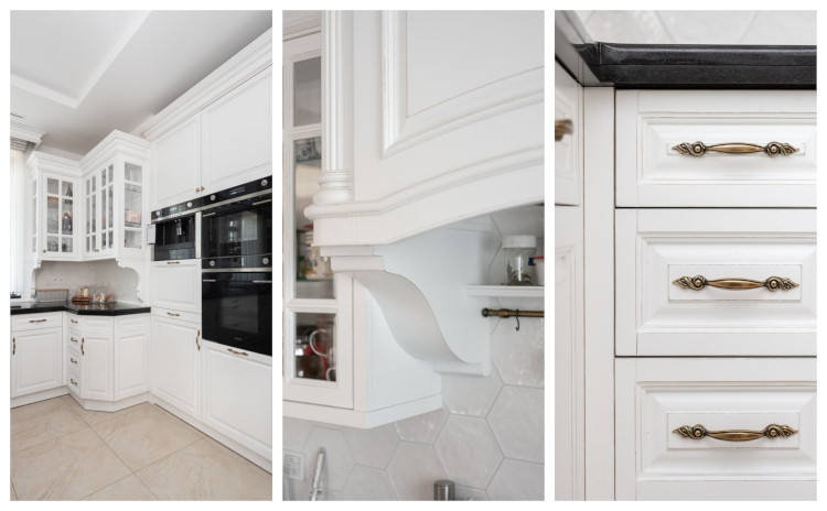 Dla uzyskania koloru kości słoniowej meble zostały pomalowane farbą kryjącą, szlifowana i ponownie lakierem. To, co charakteryzuje ten projekt, to ponadczasowość i klasa.