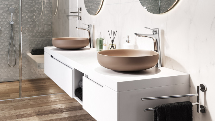 Na obszernym blacie świetnie będą wyglądały umywalki stojące, do których należy dobrać odpowiednie baterie nablatowe. Tutaj sprawdzą się z pewnością baterie nablatowe Espacio od Ferro. Ich prosta, delikatna forma uchwytów oraz smukła bryła będzie pasowała do każdej umywalki. Należy też zadbać o delikatne akcesoria, jak np. mydelniczkę metalową Grace czy podwójny wieszak na ręcznik Grace.